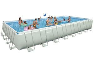 One of the largest pools among the list, Intex 32ft x 16ft x 52in Ultra Frame Pool Set can contain a maximum of 14,364 gallons of water at 90% of its volume capacity. If you have a large family, this is the best above ground pool that fits your needs.